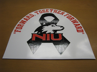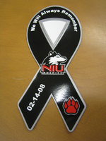 Magnets from the University Bookstore at Northern Illinois University Black ribbon-shaped magnet with silver border. In the center is a black, white and red huskie dog logo, and the bottom right strand of the ribbon has a red paw-print. Reads in white: We Will Always Remember: 2-14-08. Quantity: 2. Size: 8" long by 3.5" wide.